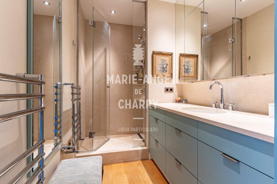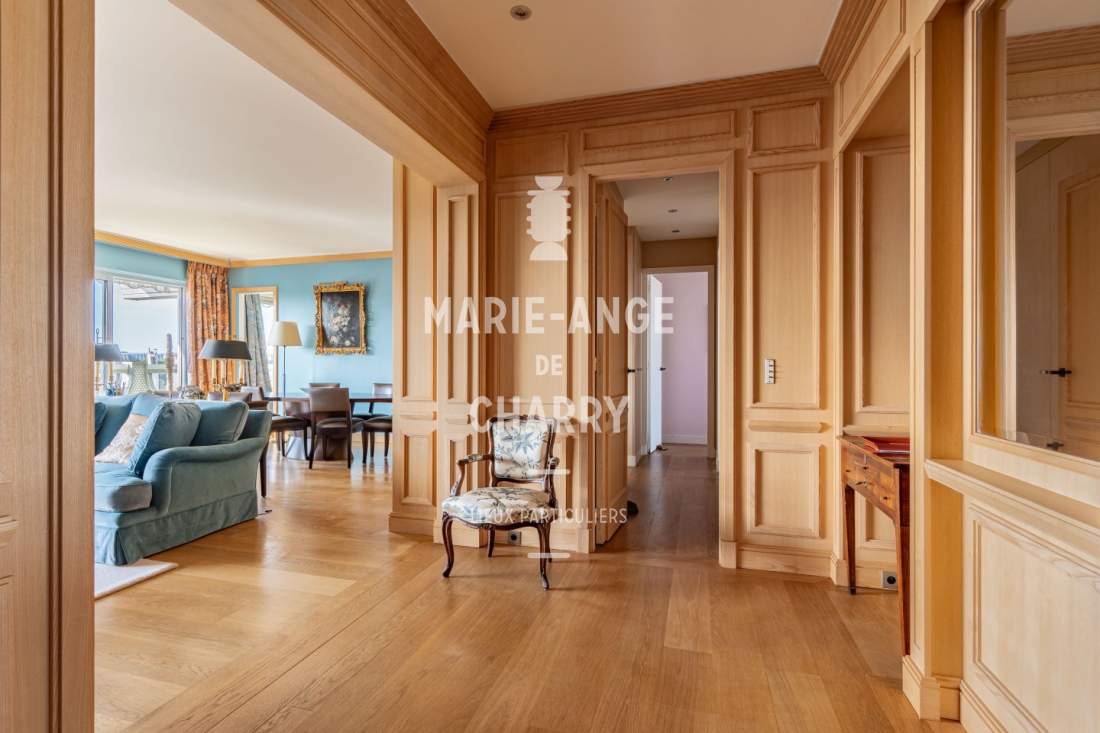 Au 9ème et dernier étage cet élégant appartement traversant sans vis à vis de 143m2 Loi Carrez ouvrant sur 24m2 de balcon/terrasse est composé de :