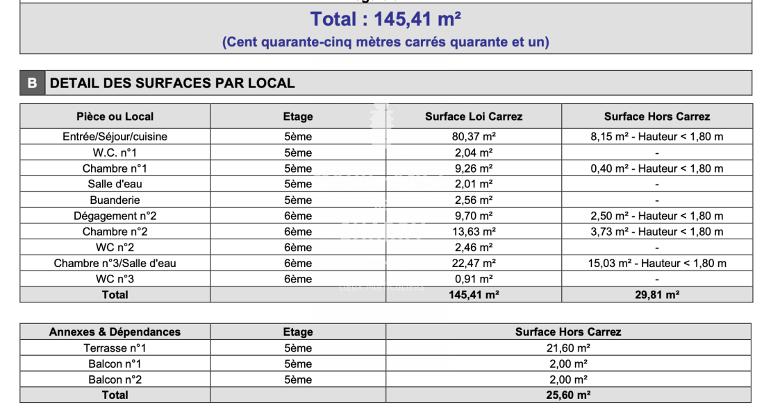 Cet appartement traversant de 175,22m2 au sol (145,41 m2 Loi Carrez) en parfait état est composé de :