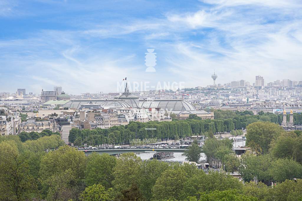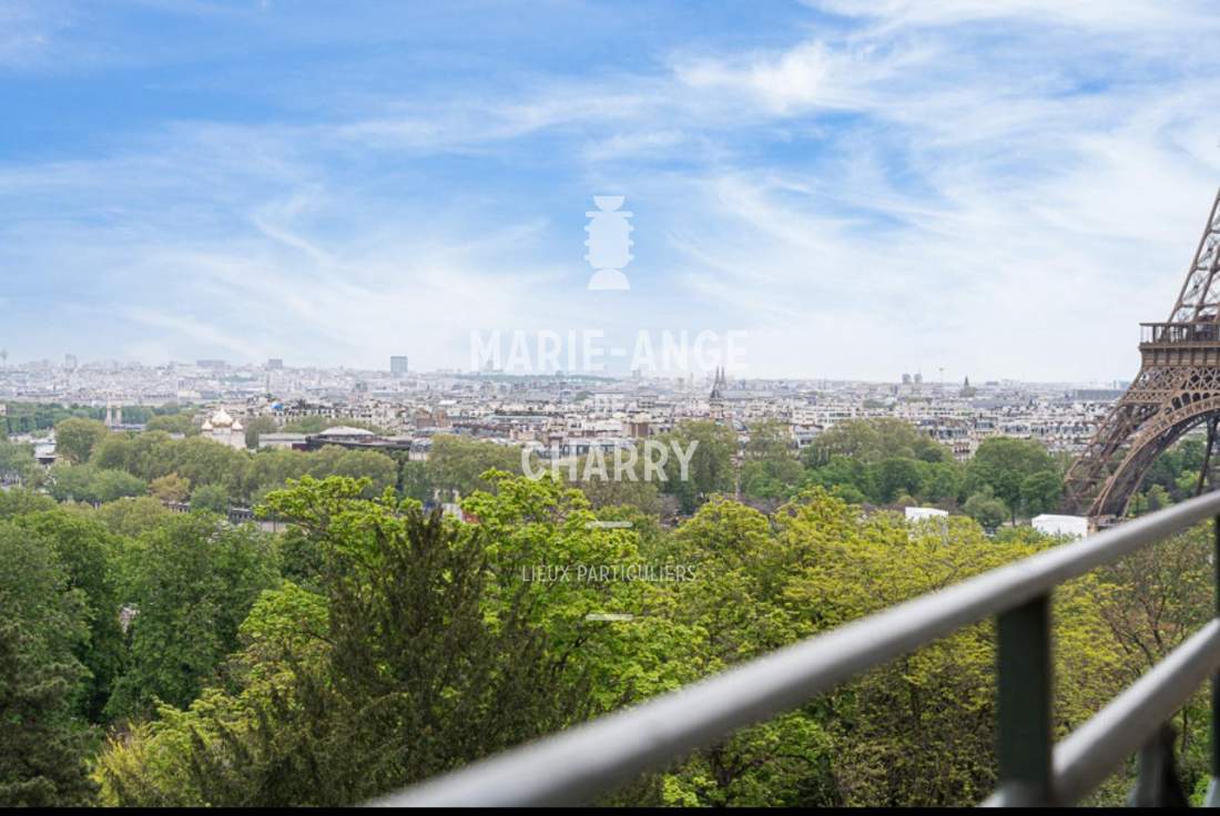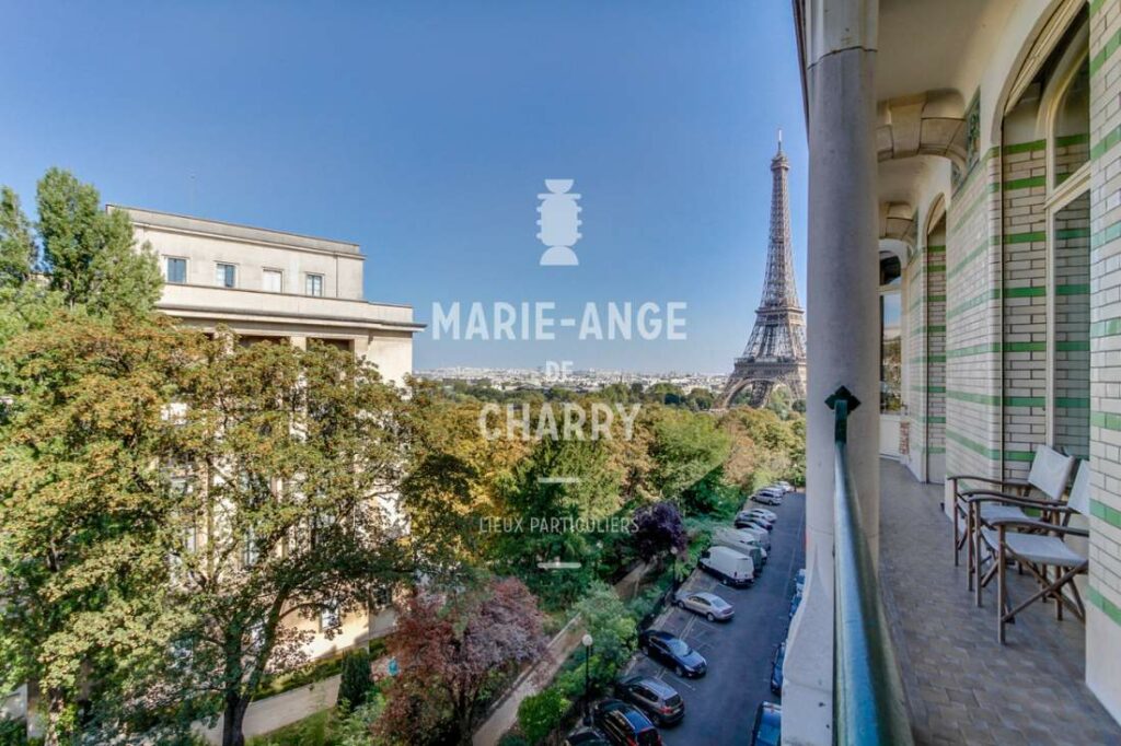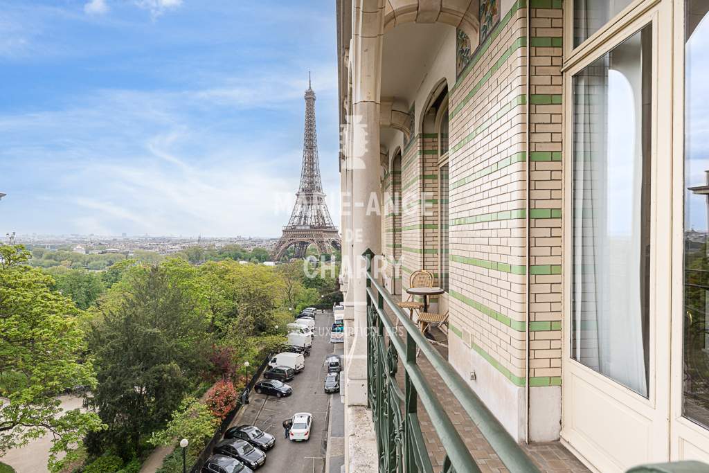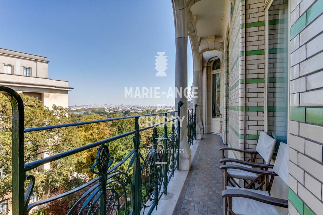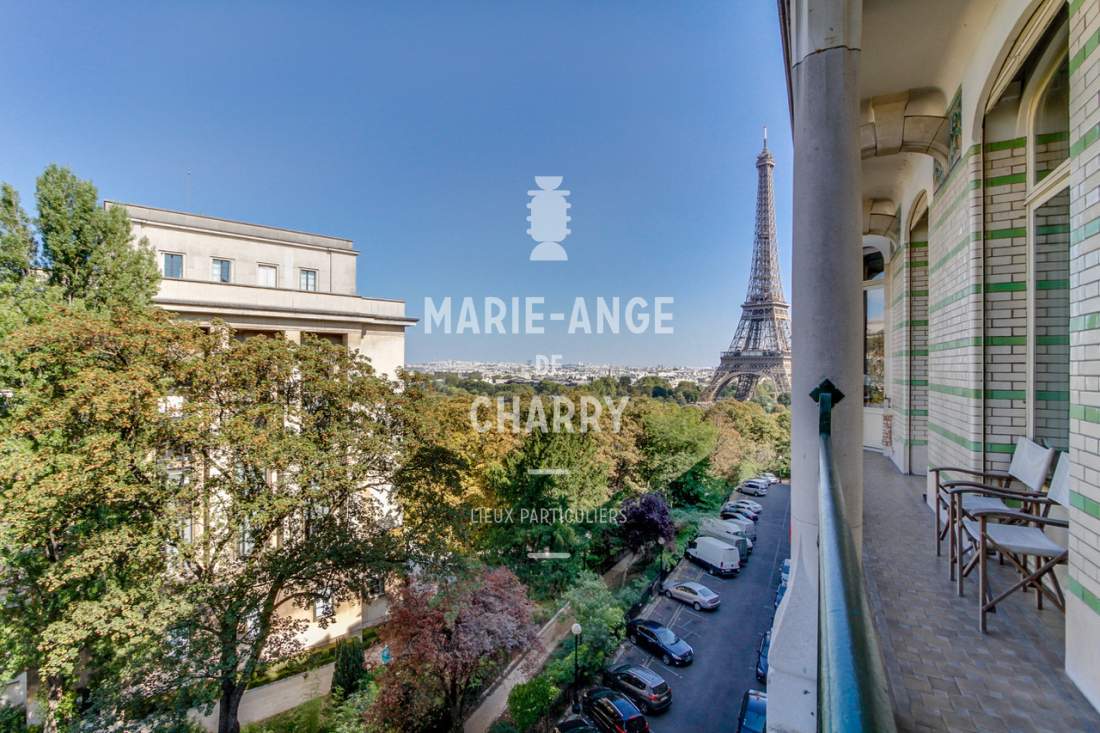 Dans une voie privée sécurisée, au 4ème étage d’un rare immeuble art Déco, exceptionnel appartement contemporain de plain pied de 446m2 ouvrant sur un balcon filant, offrant des vues sur la Seine, La Tour Eiffel et le Trocadero et bénéficiant de magnifiques volumes et de 3,60m de hauteur sous plafond.