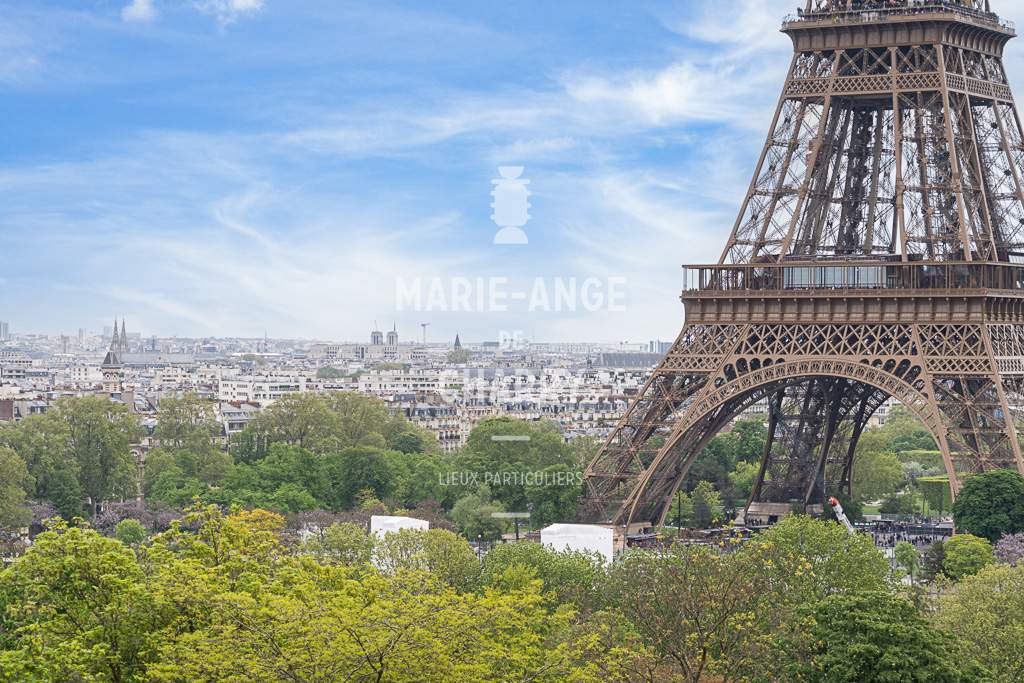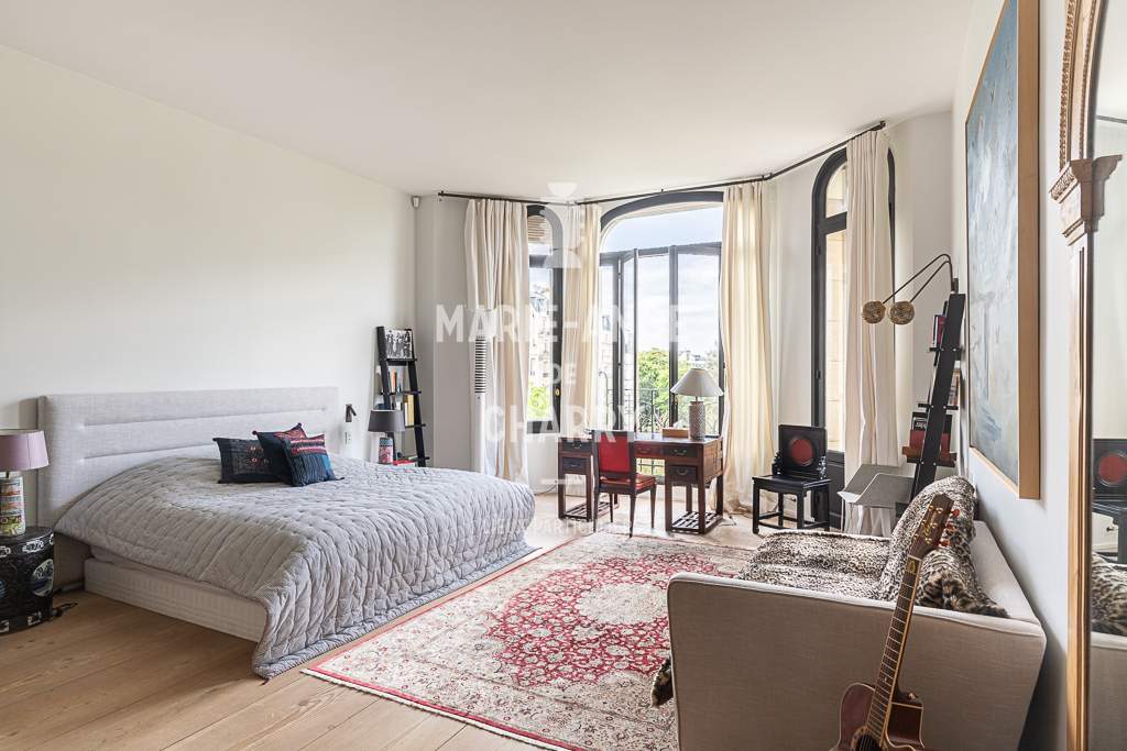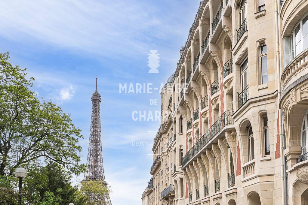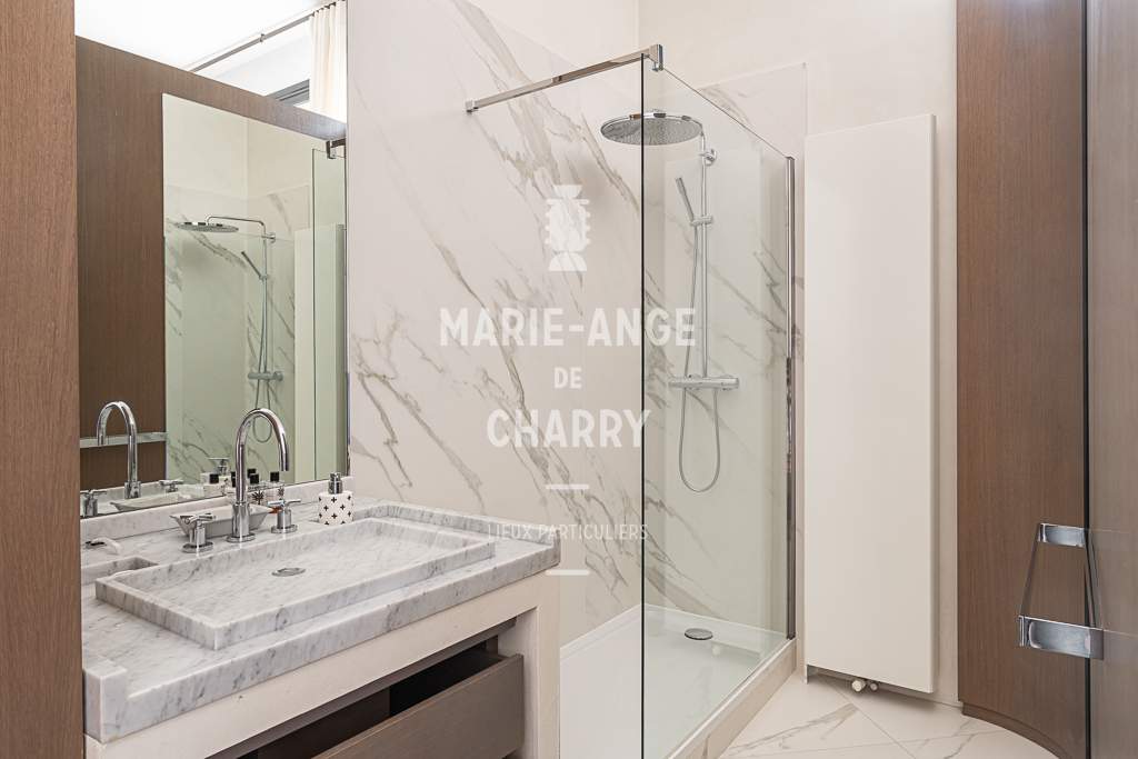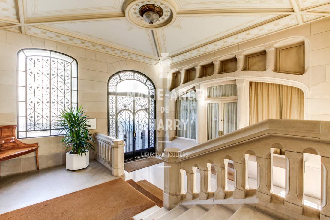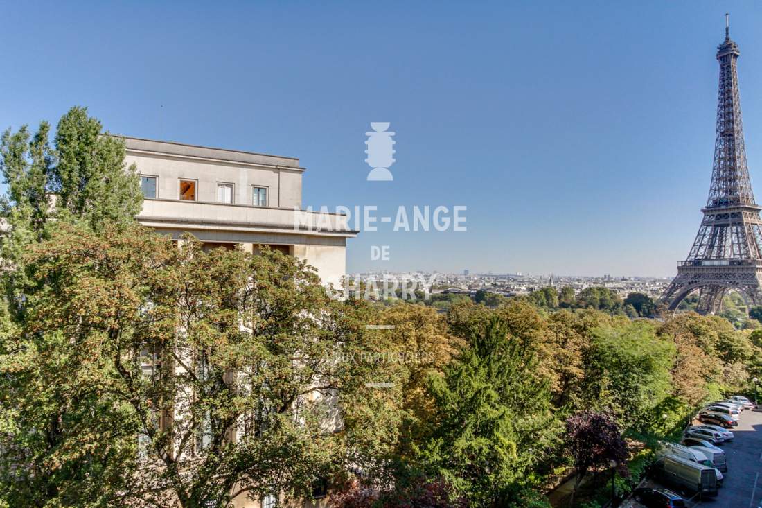 Dans une voie privée sécurisée, au 4ème étage d’un rare immeuble art Déco, exceptionnel appartement contemporain de plain pied de 446m2 ouvrant sur un balcon filant, offrant des vues sur la Seine, La Tour Eiffel et le Trocadero et bénéficiant de magnifiques volumes et de 3,60m de hauteur sous plafond.