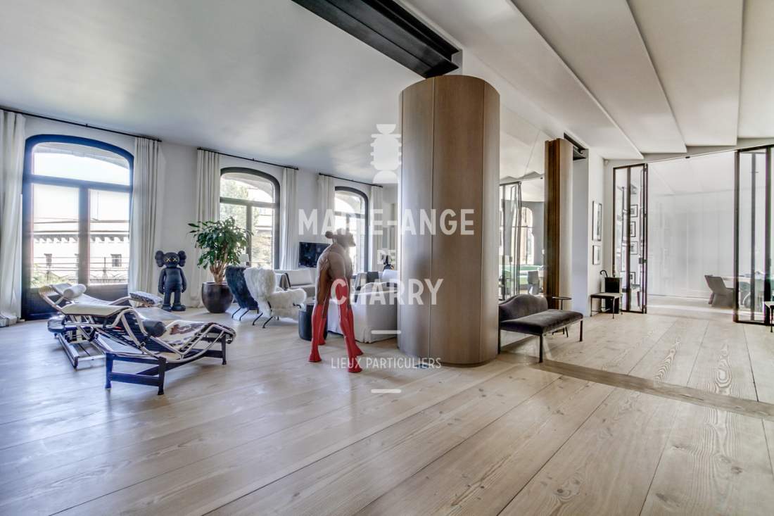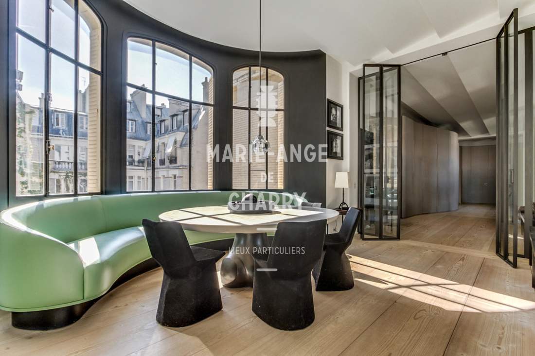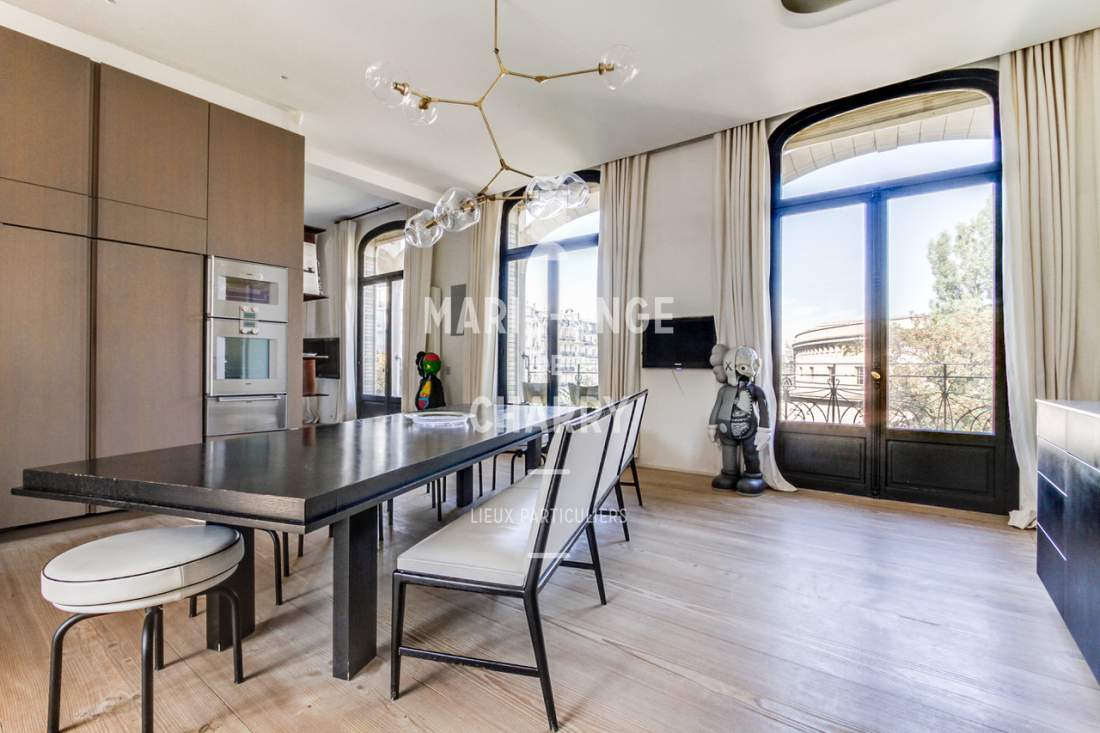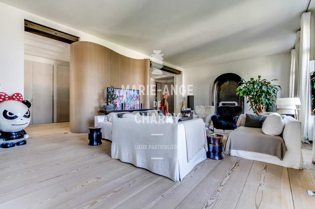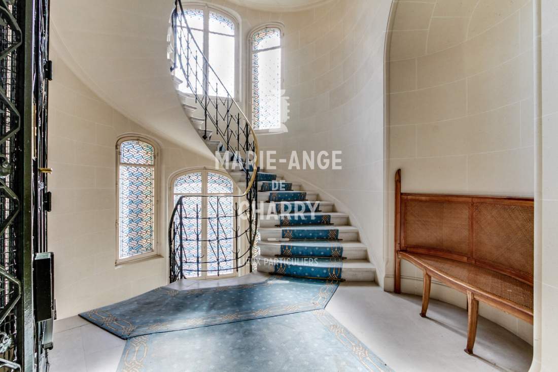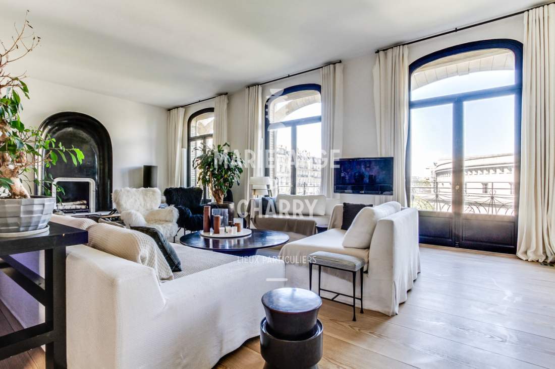 Dans une voie privée sécurisée, au 4ème étage d’un rare immeuble art Déco, exceptionnel appartement contemporain de plain pied de 446m2 ouvrant sur un balcon filant, offrant des vues sur la Seine, La Tour Eiffel et le Trocadero et bénéficiant de magnifiques volumes et de 3,60m de hauteur sous plafond.
