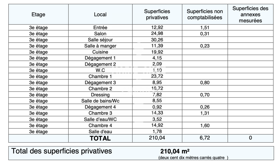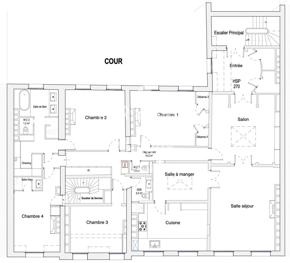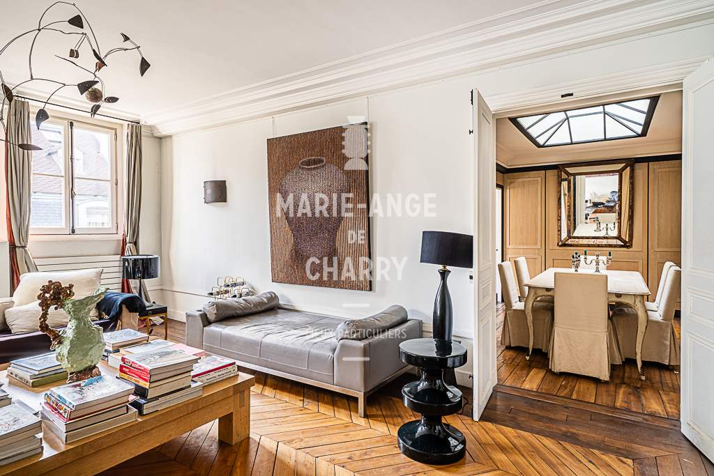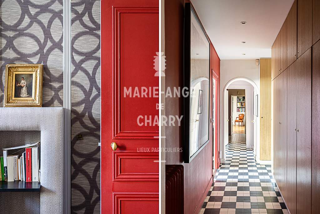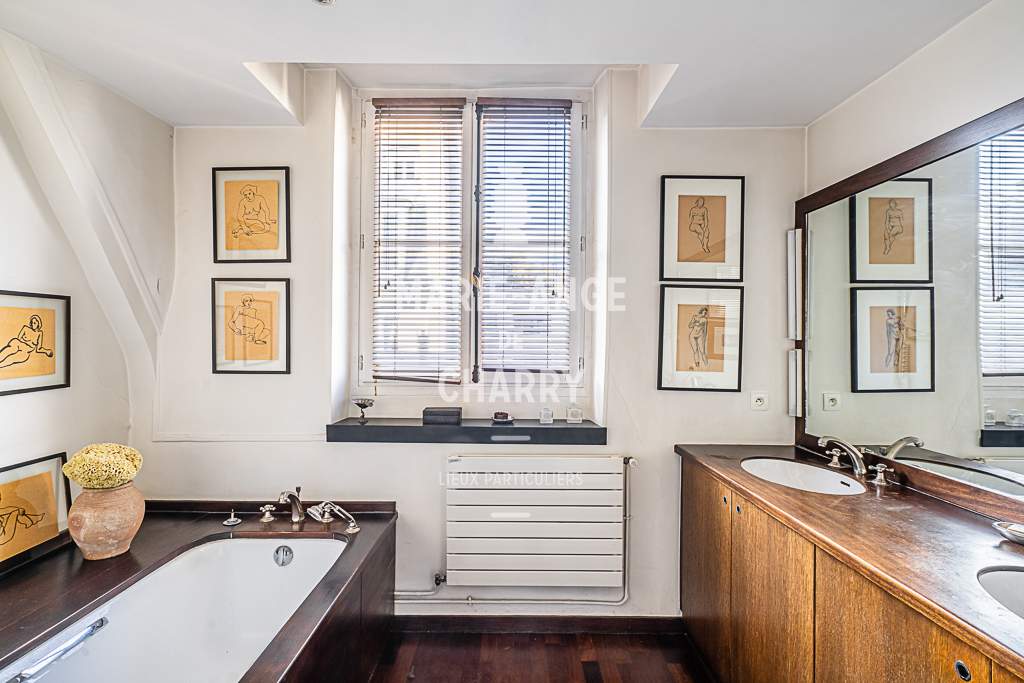 Dans un très bel immeuble XVIIIème, cet appartement en dernier étage – 3ème étage (ascenseur jusqu’au 2ème) de 216m2 au sol (210m2 Loi Carrez)bénéficiant d’un très bon plan est composé de :